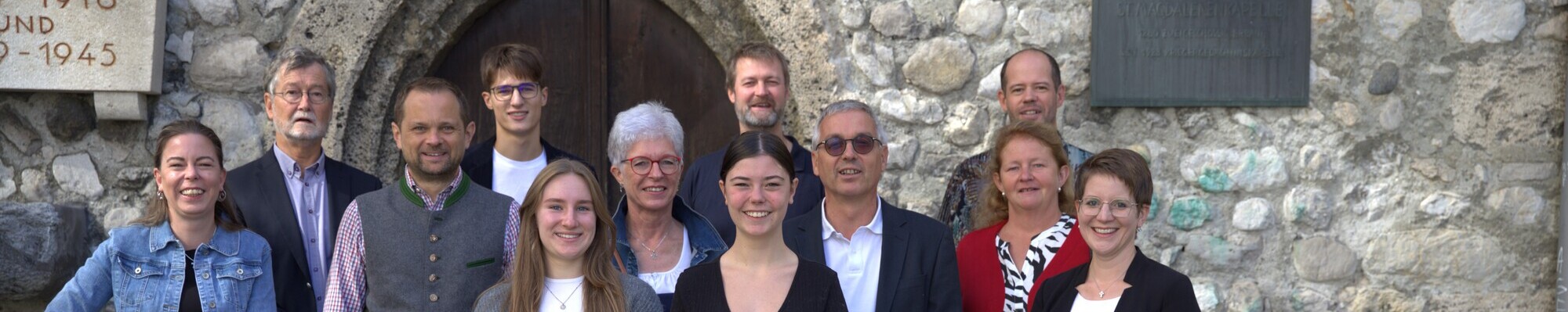 Jugendleiterin Denise Praxmarer, Heidi Eferl, Walter Kury, Markus Hergovits (seit Dezember 2024 nicht mehr im PGR), Matteo Rief, Julia Eß, Pfarrer Jakob Patsch, Sara Praxmarer (seit Februar 2025 nicht mehr im PGR), Clemens Semmelhofer (seit September 2024 nicht mehr im PGR), Monika Gärtner, Karoline Schermann (Obmann Stellvertreterin), Karl Schöpf (Pfarrgemeinderatsobmann), nicht im Bild und neu im PGR seit Februar 2025: Luise Reismann, Ronald Eß