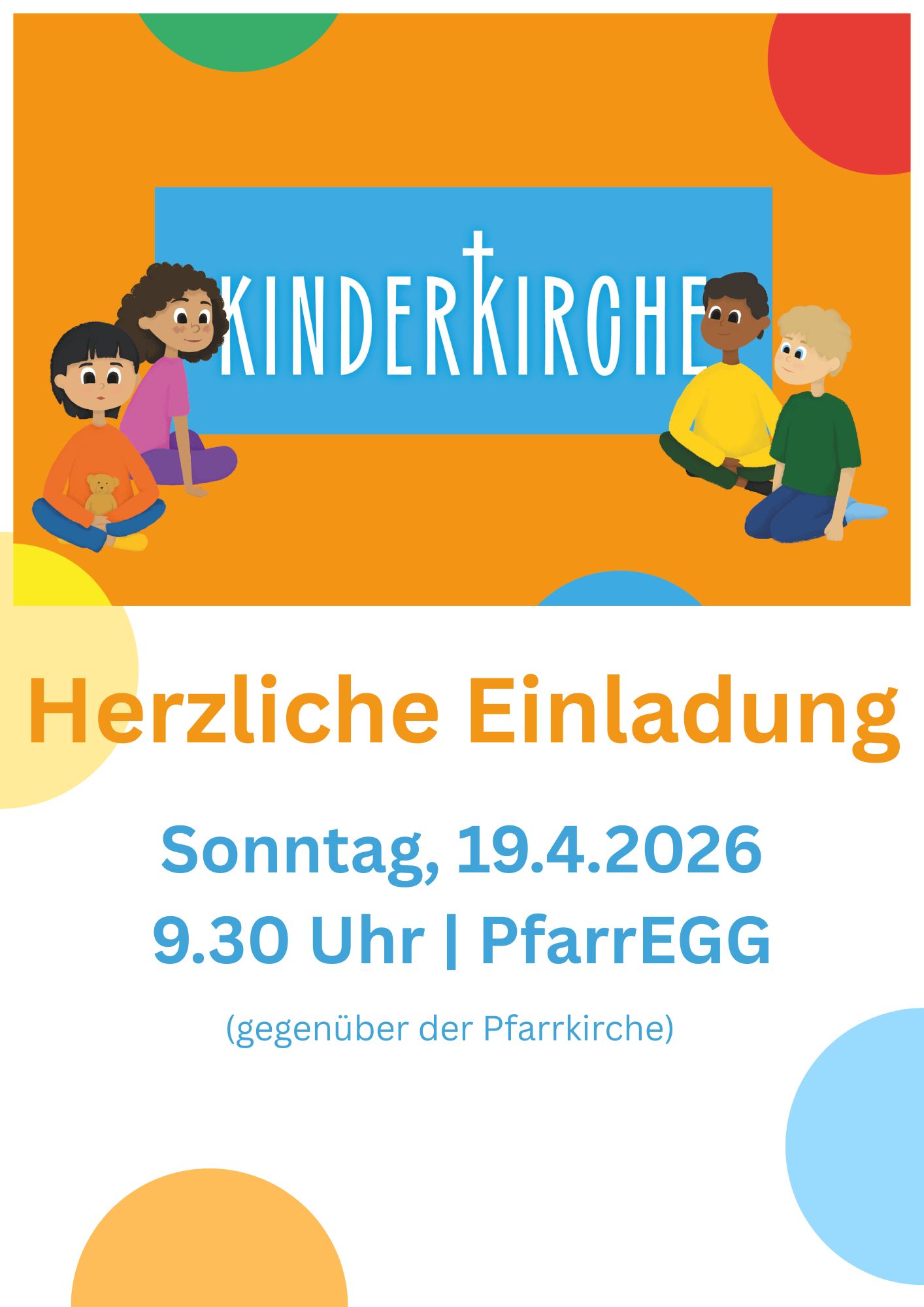Bitte kommen Sie mit Ihrem Kind in den Pfarrgottesdienst. Kurz vor dem Beginn gehen die Kinder in Begleitung ins PfarrEGG und feiern dort einen kindgerechten Gottesdienst. Mit biblischen Erzählfiguren wird das Evangelium kindgerecht erschlossen. Es wird gemeinsam gesungen und gebetet.